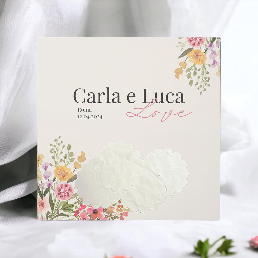 Un pensiero pieno d'amore: cartoncino e dischetti di carta riciclata con semi di fiori di campo biologici, pronti a sbocciare